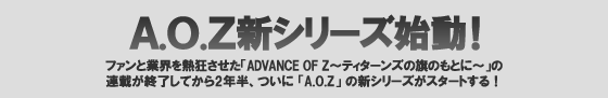 A.O.Z是? 「ADVANCE OF Z」是小說x原創機械x原創角色所展開的「機動戰士Z鋼彈」的外傳作品。從2002年開始約6年間,在電擊HOBBY Magazine上連載的「在迪坦斯的軍旗下」是由警察小說的巨匠今野敏利用“迪坦斯”方的視點所描寫的『Z』世界,當時起用了藤岡建機、齋藤卓也的機械/角色設計也成為了話題。