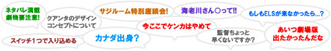 ◆沙慈的房間! 這裡是由沙慈管理的秘密房間。 節目成員得到情報,說這間房間有許多00的配音員、幕後人員出沒,因此派遣諜報部隊前往。 訪問沙慈房間的關係人士,在私底下都進行著什麼樣的對話? 從他們各自的工作來看00這部作品的魅力、 或是他們對全力製作中的劇場版有著什麼樣的感覺,問出他們真心話的談話單元。 同 時募集你想像中的來賓或幕後成員,以及對他們想問的問題! |