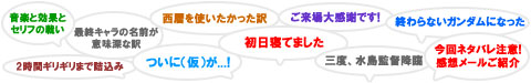 本週的手機廣播是? 天上站R這次是最終回!來賓請到水島導演與00制作團隊的各位,將為各位舉辦有著許多其他地方聽不到的秘辛♪的座談會! 接下來,節目成員為了各位聽眾,擄獲了包括水島導演在00制作中一直使用的愛用品等許多寶物!貴重的製作秘辛與只有在這裡才能得到的貴重贈品内容是聽過廣播之後才能享受的樂趣! 在手機網站上接受申請,請務必確認看看喔♪ |