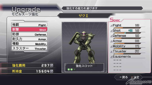 可強化的項目有「格鬥」、「射撃」、「防禦」、「耐久力」、「機動」、「推進器」等六項,玩家可以在欄位範圍內自由設計。
