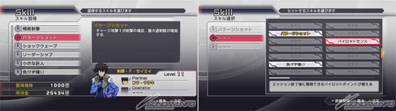 承襲自前作,駕駛員從任務裡可以獲得經驗値『駕駛員點數』提昇等級,隨著升級經驗值的數值也會成長。和前作不同的是,靠著裝備技能獲得各式各樣的效果這點,變成由『商店』購買取得。