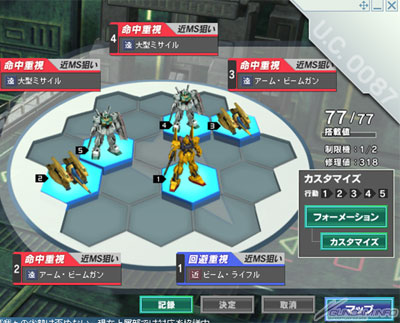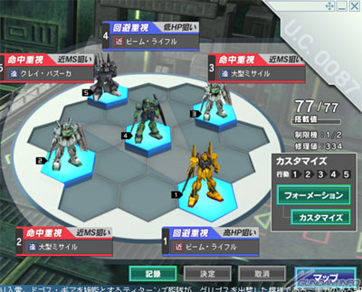 在陣形選擇「自訂4(編列4台機體)」或「自訂5(編列5台機體)」,就能自由設定各小隊的「配置位置」、「攻防指示」、「攻擊距離」與「AI設定」。
