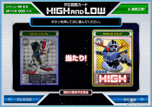 「MS圖鑑卡片 High&Low」是指在遊戲內的「太空站」裡,過關一次以上就可以進行一天挑戰一次的迷你遊戲。從蓋住的兩張MS圖鑑卡片裡,挑出等級較高的就算答對,可以得到獎品。