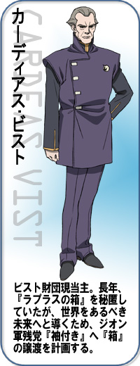 畢斯特財團的宗主賽亞姆・畢斯特於U.C.0001年發現的謎樣物體。據說只要將『盒子』打開,就會揭發足以顛覆地球聯邦的秘密。 |