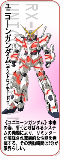 《獨角獸鋼彈》搭載的系統,一旦察覺到敵機的精神感應便解除一切限制,變更為毀滅模式。甚至可干擾敵機的感應砲。 |