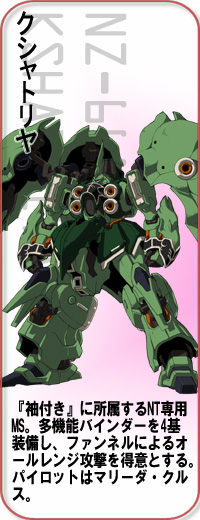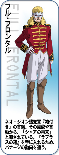 新吉翁殘黨軍。於U.C.0096年時不斷與聯邦軍展開零星的戰鬥。他們搭乘的MS胸前和袖口皆採用共通的裝飾。