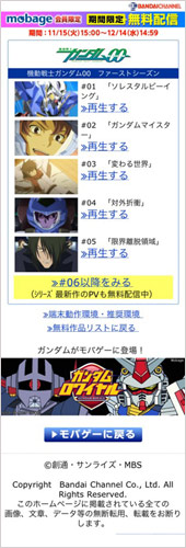 由BANDAI CHANNEL和Mobage合作,可免費觀賞『機動戰士鋼彈00 第一季』1~5話。