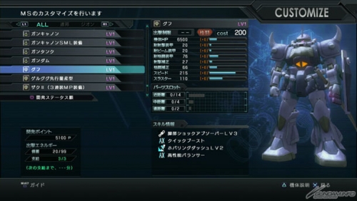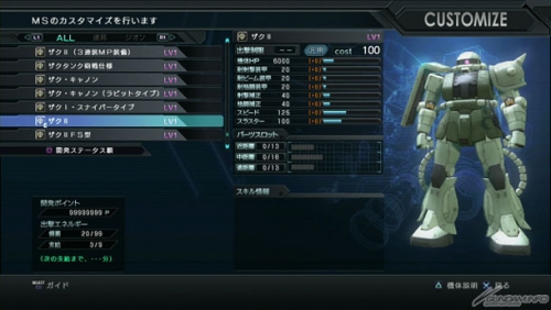 導入MS成本概念 | 導入MS的點數概念。 雖然說不分MS 的機種,在擊墜時一律會獲得戰果點數,但是藉由強MS(=高成本)得到高點數、弱MS(=低成本)得到低點數這樣的配置,強MS將有高風險,而弱MS就可以比較輕鬆地使用。根據遊玩時間以及取得MS將會使遊戲內的進行更加平衡。 |