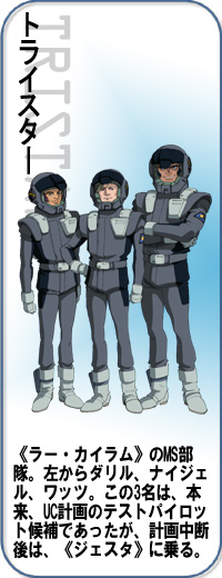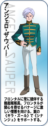 受隆德・貝爾司令官布萊德之託,與『帶袖的』的辛尼曼進行交涉的凱・西登。曾在白色基地與阿姆羅和布萊德一同參與過一年戰爭的他,在U.C.0096年時以記者的身分活躍。 |