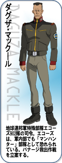 在《類・阿含號》上服役的醫務官。在『Z鋼彈』中的格利普斯戰役時在《阿含號》上服役,從『鋼彈ZZ』的第一次新吉翁戰爭開始便在《類・阿含號》上服役的老兵。 |