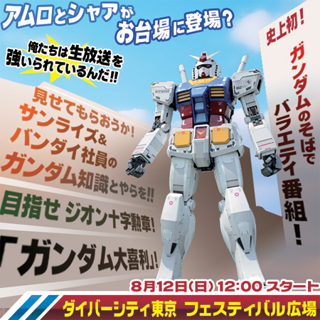「NAMCO BANDAI LIVE TV」夏之3連彈SPECIAL第1彈鋼彈特別節目「夏之鋼彈祭」是從位於東京・台場「Diver City東京 Plaza」的FESTIVAL廣場前站立的實物大鋼彈立像前,於8月12日(日)12:00起發布現場直播。