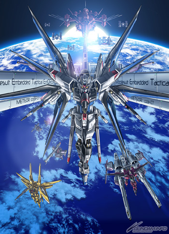 這次的主宣傳圖由本作機械作畫總監・重田智全新親筆繪製,跟「攻擊自由鋼彈」跟流星合體後面對最終決戰的精悍姿態、「無限正義鋼彈」、「曉」、「德姆騎兵」都繪製在圖中,展現驚人魄力。