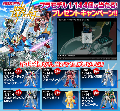 活動是專為BANDAI CHANNEL的付費會員所舉辦,將抽出144名幸運兒每人贈送一台鋼彈模型。獎品有「HG 全裝備型製作攻擊鋼彈」和「HG驚異薩克」等6種『鋼彈創鬥者』的鋼彈模型。。