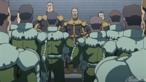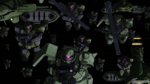 吉翁軍。反之,為了挽回劣勢而以壓倒性戰力來對抗的地球聯邦軍。薩比家錯綜的陰謀、被難以改變的命運玩弄於掌心的雪拉‧瑪斯、